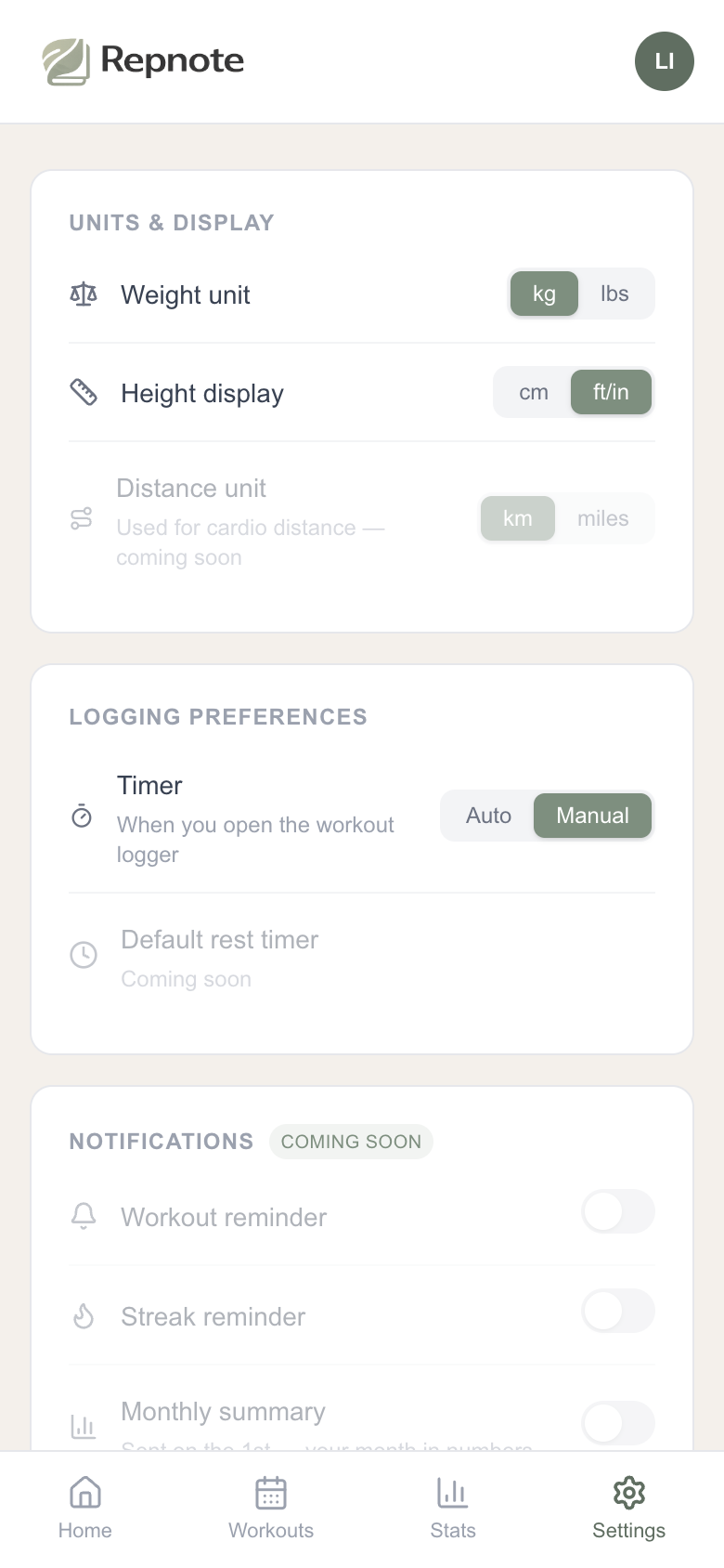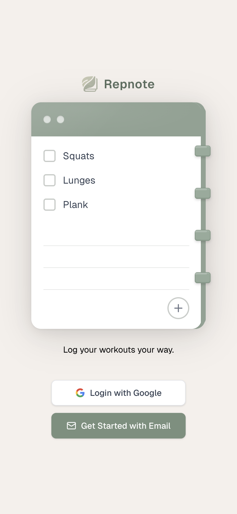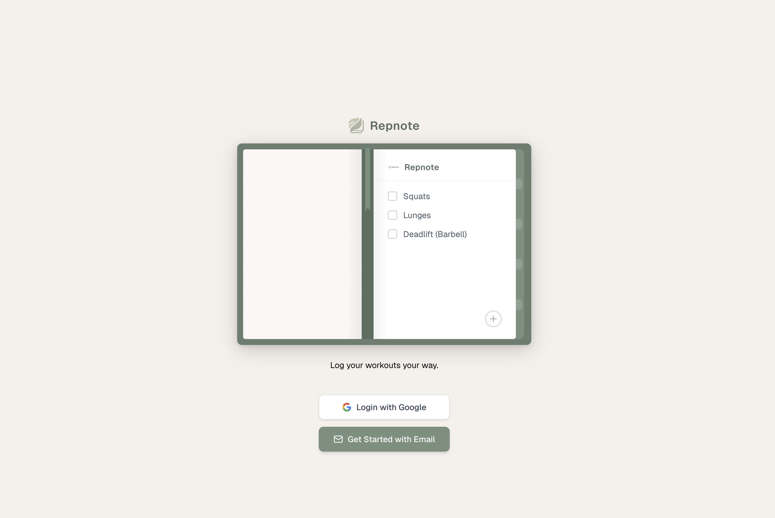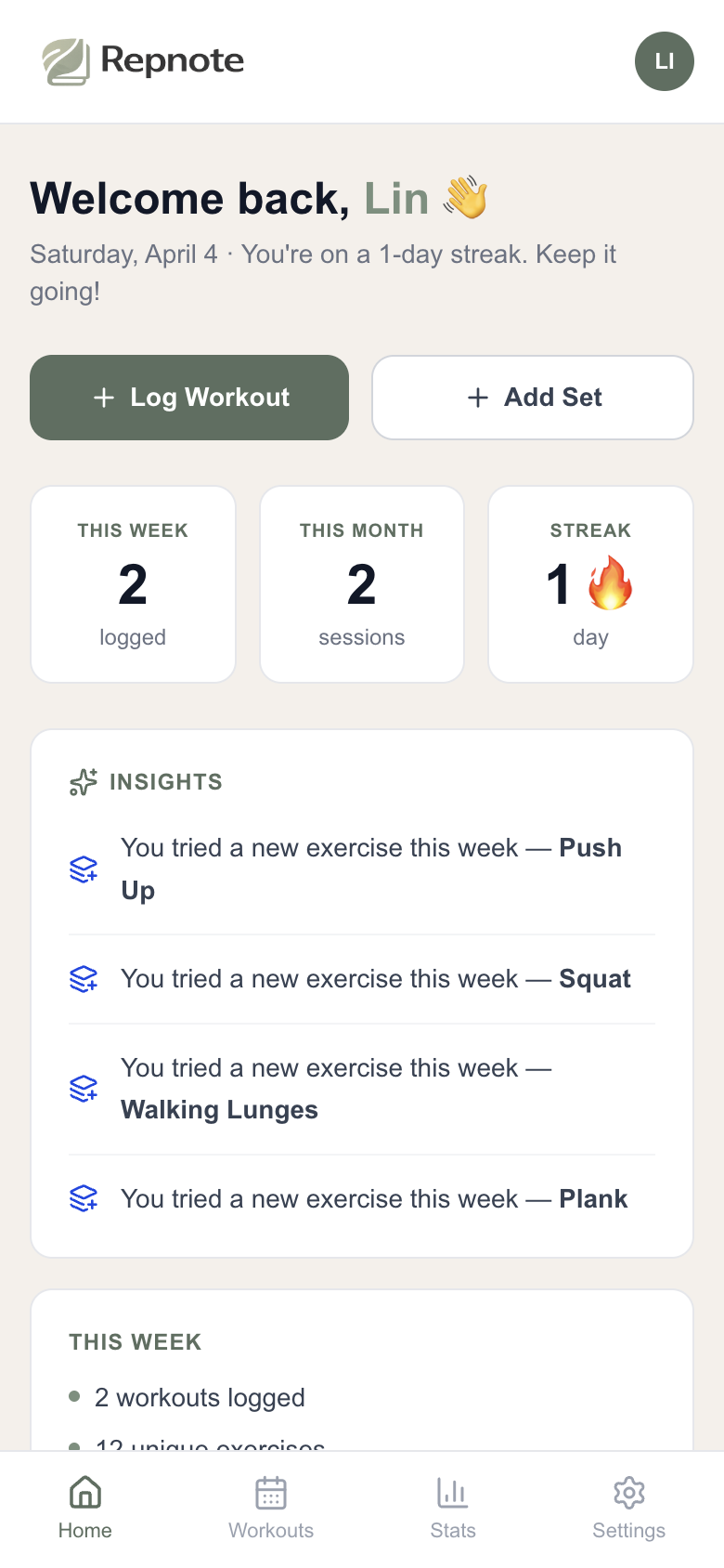 RepNote is a fitness tracking web app focused on logging workouts and seeing progress over time. It is built as a practical product surface for sets, reps, and consistency.